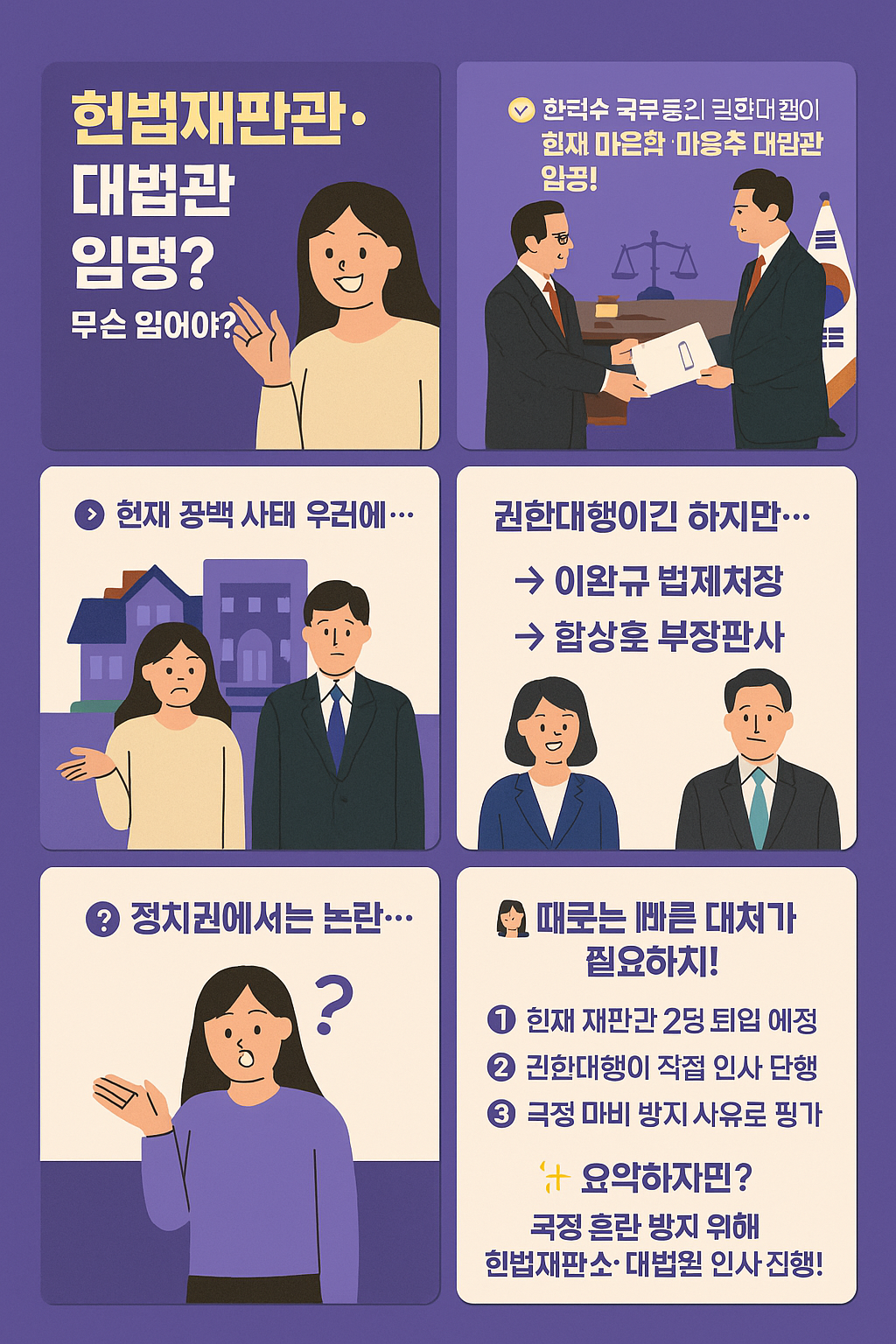 오늘은 뉴스에서 좀 어렵게 들릴 수 있는 헌법재판관, 대법관 임명 소식을 쉽게! 재미있게! 알려줄게요. 뉴스에서 "대통령 권한대행", "헌재 공백", "정치권 논란" 이런 말들 많이 들었죠? 👉 그게 바로 이번 이슈의 핵심이에요!
