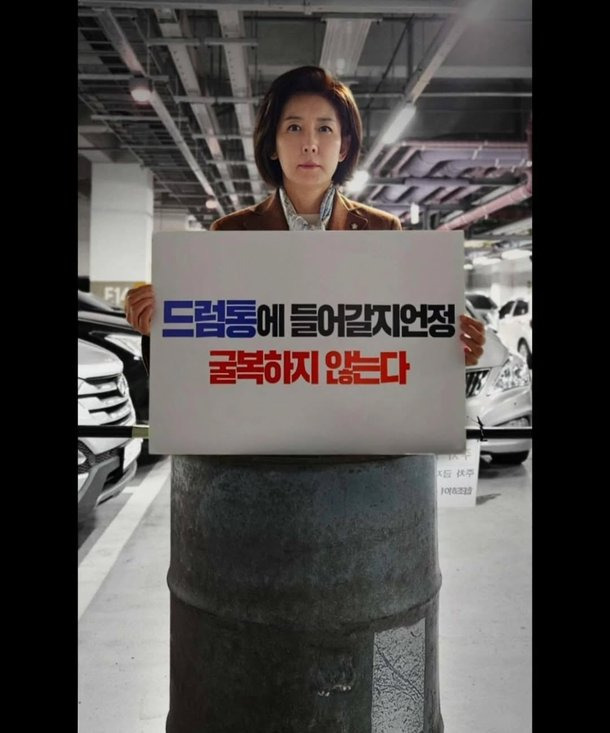 나경원 의원이 4월 15일 인스타그램에 **“드럼통에 들어갈지언정 굴복하지 않겠다”**는 문구가 적힌 피켓을 들고,