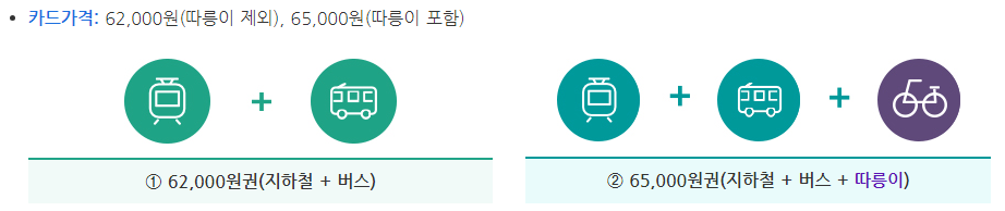 기후동행카드 요금은 총 두 종류가 있습니다. 지하철과 버스만 이용하는 요금제와 공유자전거 따릉이를 포함한 요금제가 있어요. 평일에 출퇴근만 생각한다면 6만2천원의 지하철+버스 요금제를 선택할 수 있고, 주말이나 야간에 자전거를 타는 분들은 6만5천원의 지하철+버스+따릉이 요금제를 선택할 수도 있겠죠?