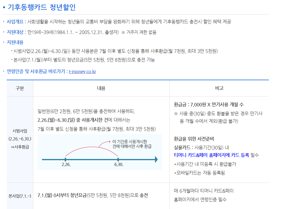또 청년들이라면 할인혜택까지 챙길 수 있으니 큰 장점이 되겠죠? 본사업이 실시되는 7월부터는 월 요금 5만5천원 또는 5만 8천원으로 충전할 수 있다고 합니다. 6개월마다 홈페이지에 연령 확인을 받긴 하지만 그 정도는 할 수 있잖아요?ㅎㅎ