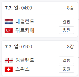 바로 이어서 일요일인 7일에는 새벽 1시에 잉글랜드와 스위스의 경기가 있고, 새벽 4시에 네덜란드와 튀르키예의 경기가 이어집니다. 주말 이틀간 큰 경기가 이어지면서 축구팬들의 관심이 집중될 것 같은데요. 늦은 시간이라 치킨을 찾기도 쉽지않겠습니다 ㅎㅎ