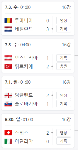 간밤의 경기 결과로 네덜란드와 튀르키예가 UEFA 유로 2024의 8강을 확정지었습니다. 가장 빨랐던 6월 30일 경기에서 독일과 스위스가 각각 2대 0으로 8강을 먼저 확정지었고, 7월 1일에는 스페인이 조지아를 4대 0으로 대파하고 잉글랜드가 슬로바키아를 2대 1로 이기면서 8강에 올라섰습니다.