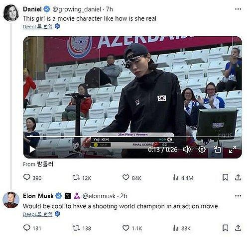 김예지 선수는 2024년 파리 올림픽에서 은메달을 획득 외에도 지난 5월 국제 사격연맹(ISSF) 바쿠 사격 월드컵에서 25m 권총 결선 당시 세계 신기록을 세웠는데요. 이런 대단한 결과에도 평소와 다름 없는 모습을 담은 영상을 두고 SNS X(트위터)에서 태슬라의 일론 머스크가 "따로 연기할 필요 없다. 액션 영화에 캐스팅해야한다"는 리트윗을 게시하여 화재를 모았습니다. 이 당시에 "나는 운동선수"라는 신념으로 본업인 사격에 집중하겠다는 의사를 밝힌 김예지 선수는 이번에 생각을 바꿔서 앞으로는 본업에 무리가 가지 않는 선에서는 각종 광고와 드라마, 영화 등에 참여하겠다고 했습니다.